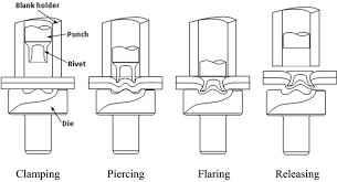 - 펀치와 다이로 금속 판재를 눌러 형상 변형으로 맞물리게 하는 방식
